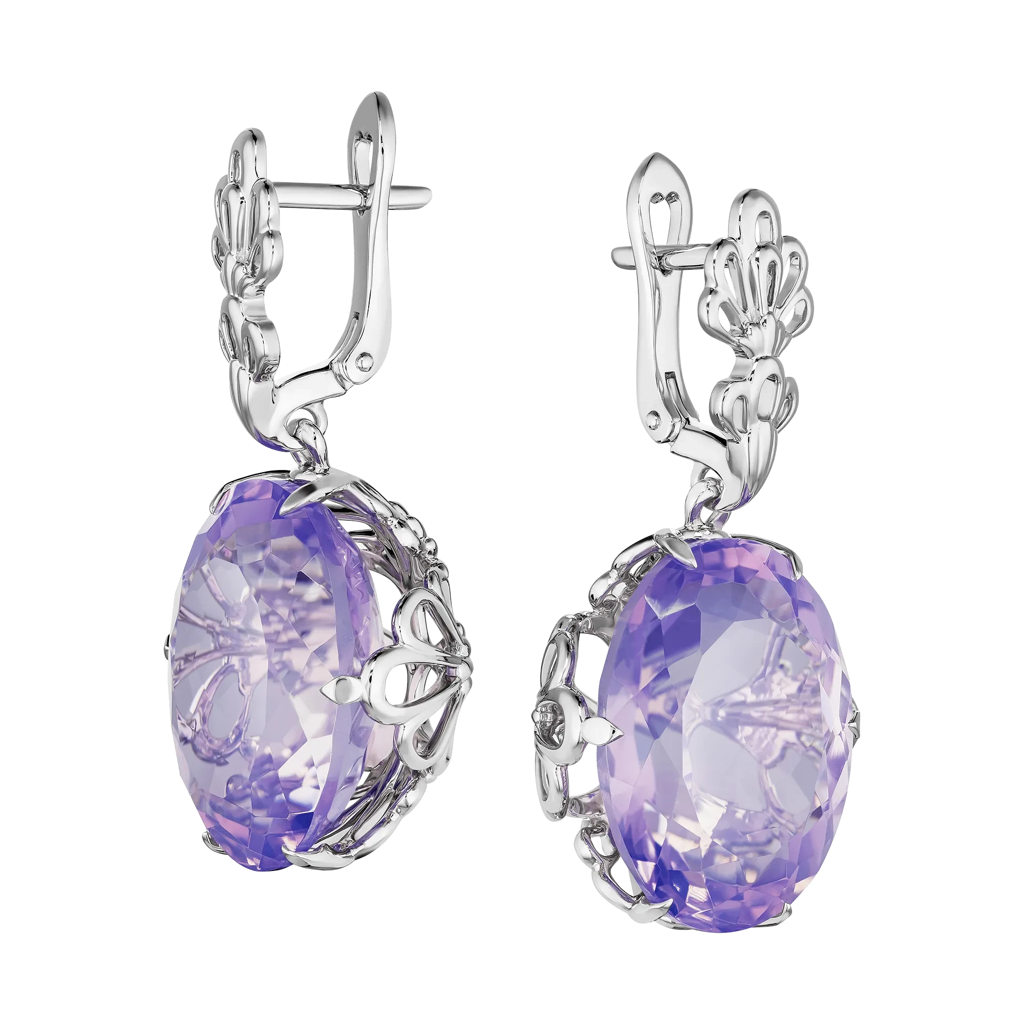 Лавандовые аметисты формируют основу композиции, демонстрируя светлую сиреневую палитру с холодными, воздушными нюансами. Такие камни ценятся за чистоту и равномерность цвета, а также за способность пропускать свет сквозь кристалл, создавая мягкое внутреннее сияние.
