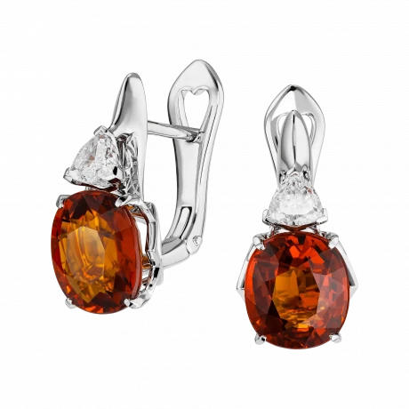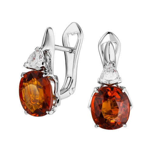 Над каждым камнем расположены бриллианты треугольной огранки, создающие направленный световой акцент и подчёркивающие интенсивность оттенка. Белое золото формирует лаконичную основу, позволяя композиции звучать чисто и выверенно.