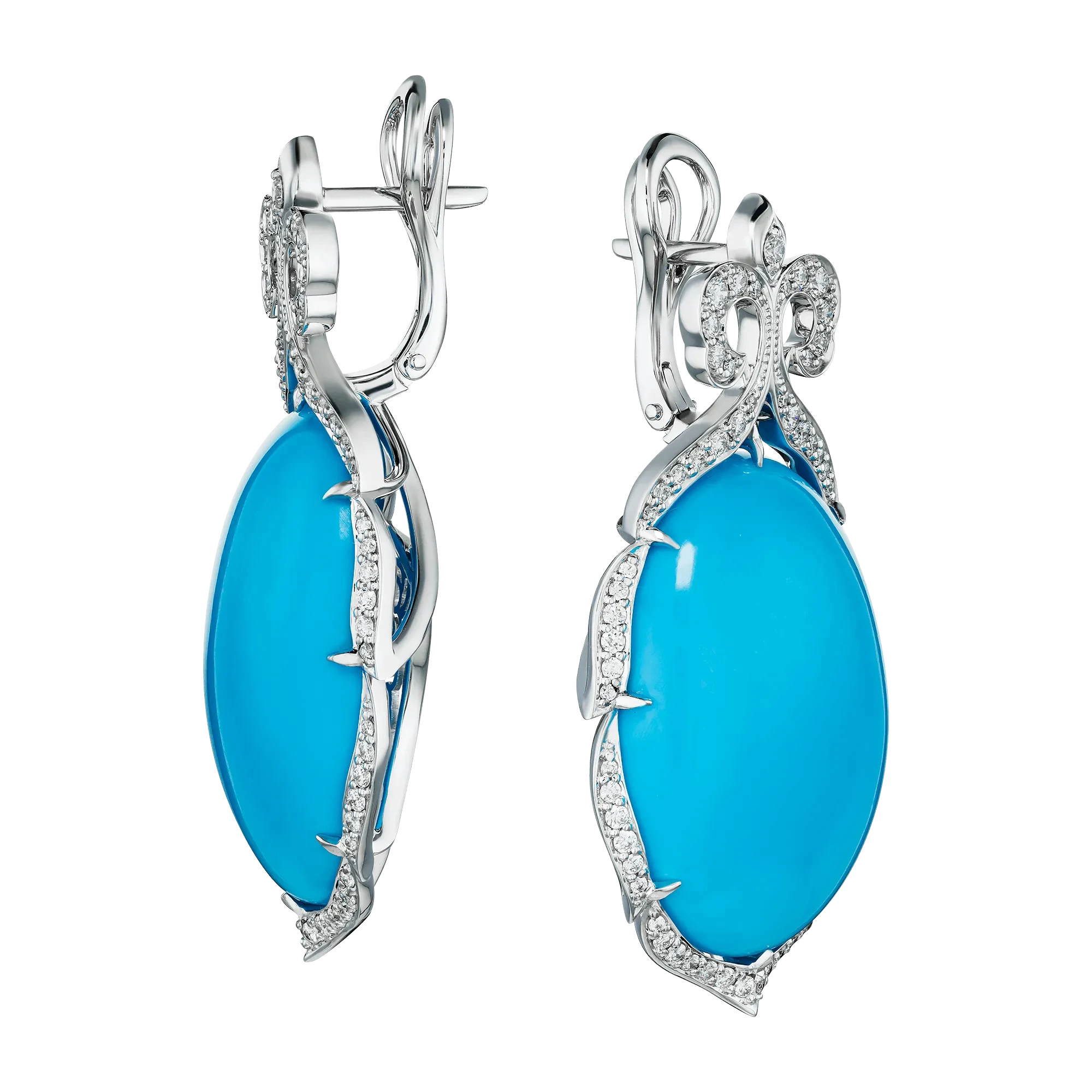 Бриллианты образуют вокруг бирюзы тонкое сияющее обрамление, усиливая насыщенность её оттенка и создавая выразительный контраст между холодным блеском прозрачных камней и насыщенной голубой гладью кабошонов. Ажурная оправа из белого золота выстроена плавными восходящими линиями, которые визуально приподнимают камни и придают всей композиции ощущение движения и воздушности.