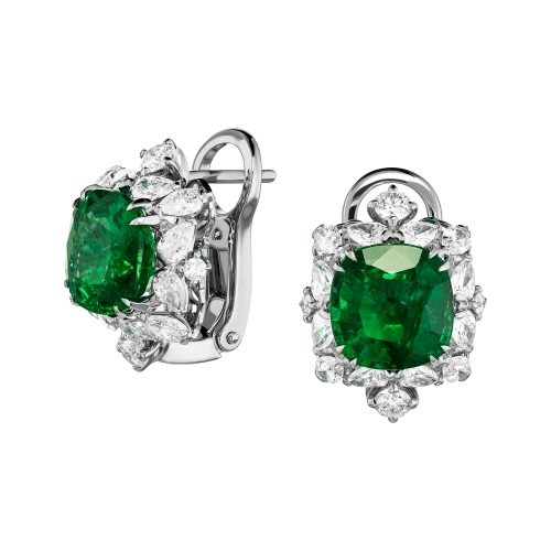 Обрамление из крупных бриллиантов разной огранки формирует световой ореол вокруг каждого изумруда, усиливая эффект внутреннего свечения. Эти акценты создают тонкое ощущение движения – словно чувство превращается в свет и приобретает форму.