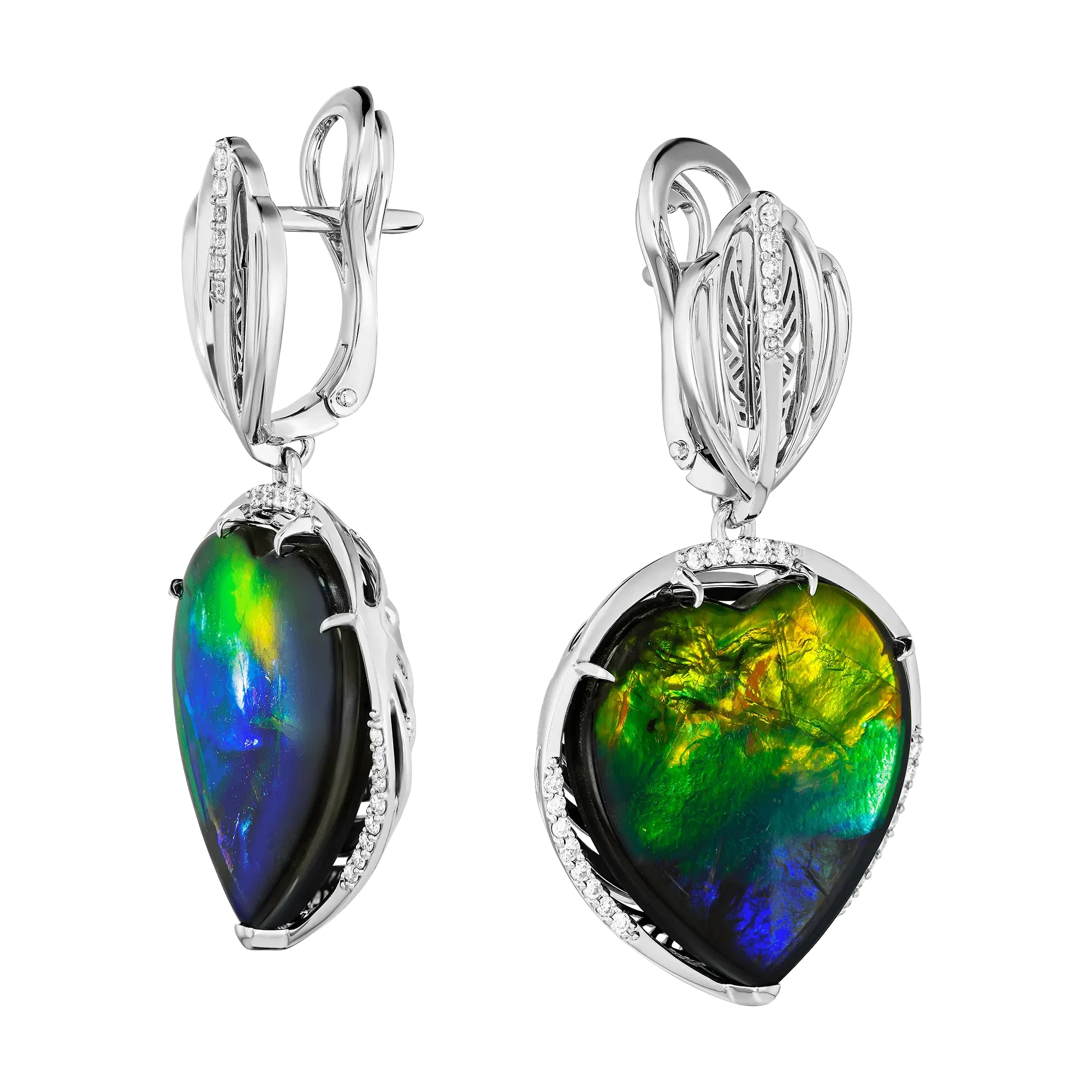 В центре композиции — аммолиты общим весом 32,68 карата, редкие органические самоцветы, сформированные из окаменевших раковин аммонитов, обитавших в доисторических океанах. Именно их природная структура рождает уникальный оптический эффект: при движении света поверхность камня переливается оттенками зелёного, огненно-оранжевого и золотого, словно фрагменты галактик, пойманные в кристалле. Ни один аммолит не повторяет другой, и каждый из них — отдельная вселенная со своим ритмом и цветом.